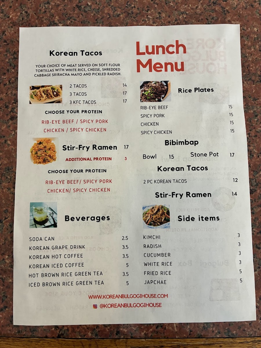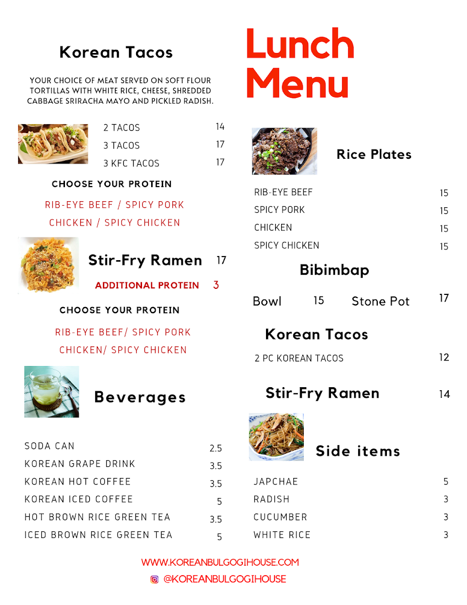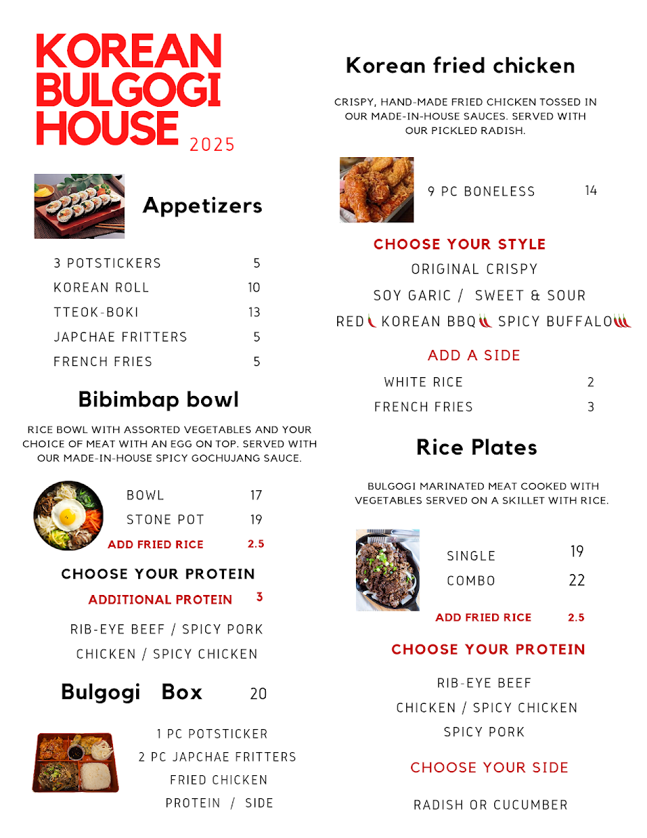 Your choice of beef or spicy pork and 1 style of korean fried chicken served with rice. 1 potsticker, 2 japchae fritters and 1 choice of side.