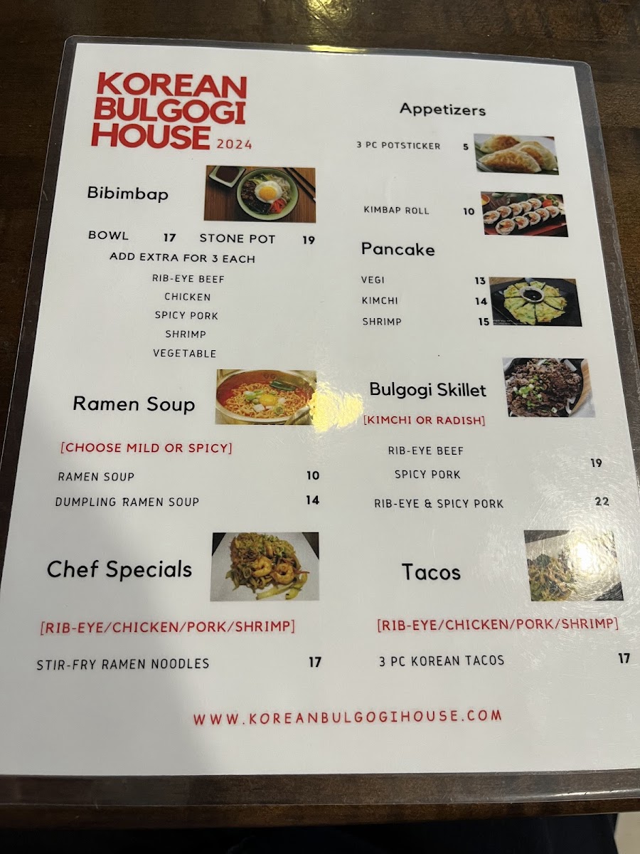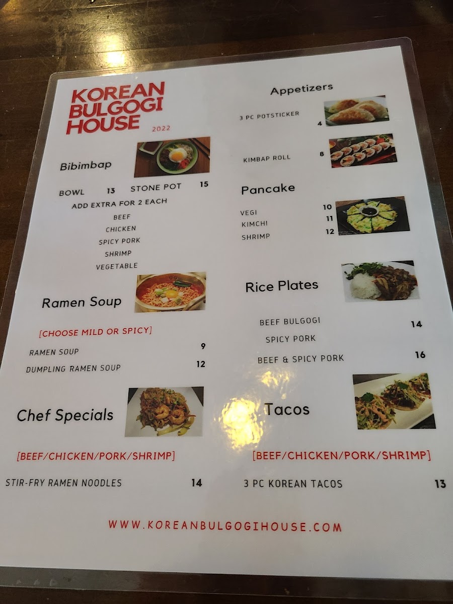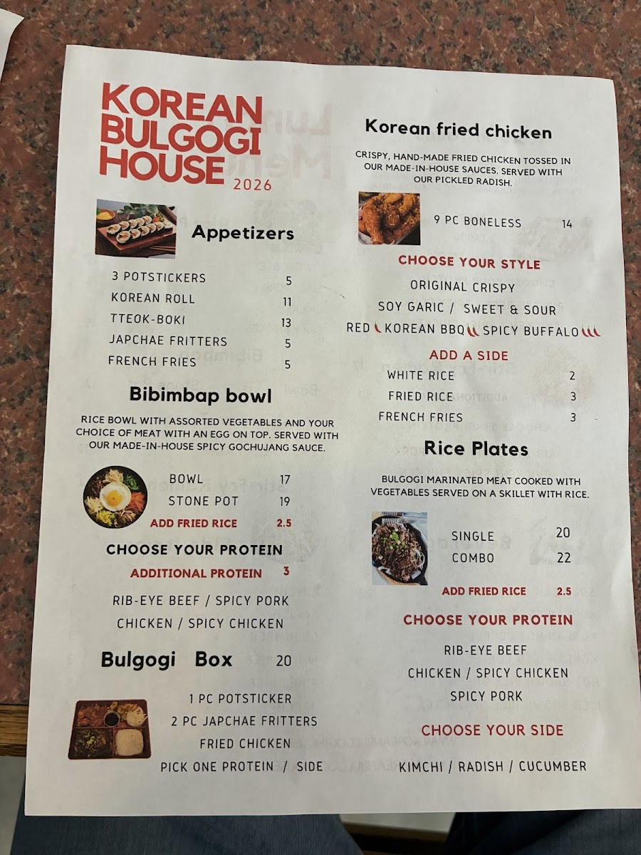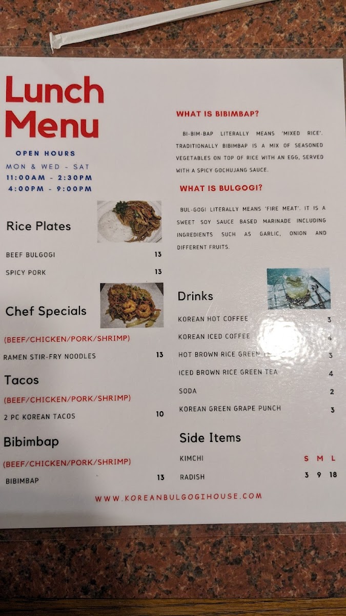 Bulgogi combination rice plate. Served with white rice, japchae noodles and your chooce of pickled radish and kimchi.